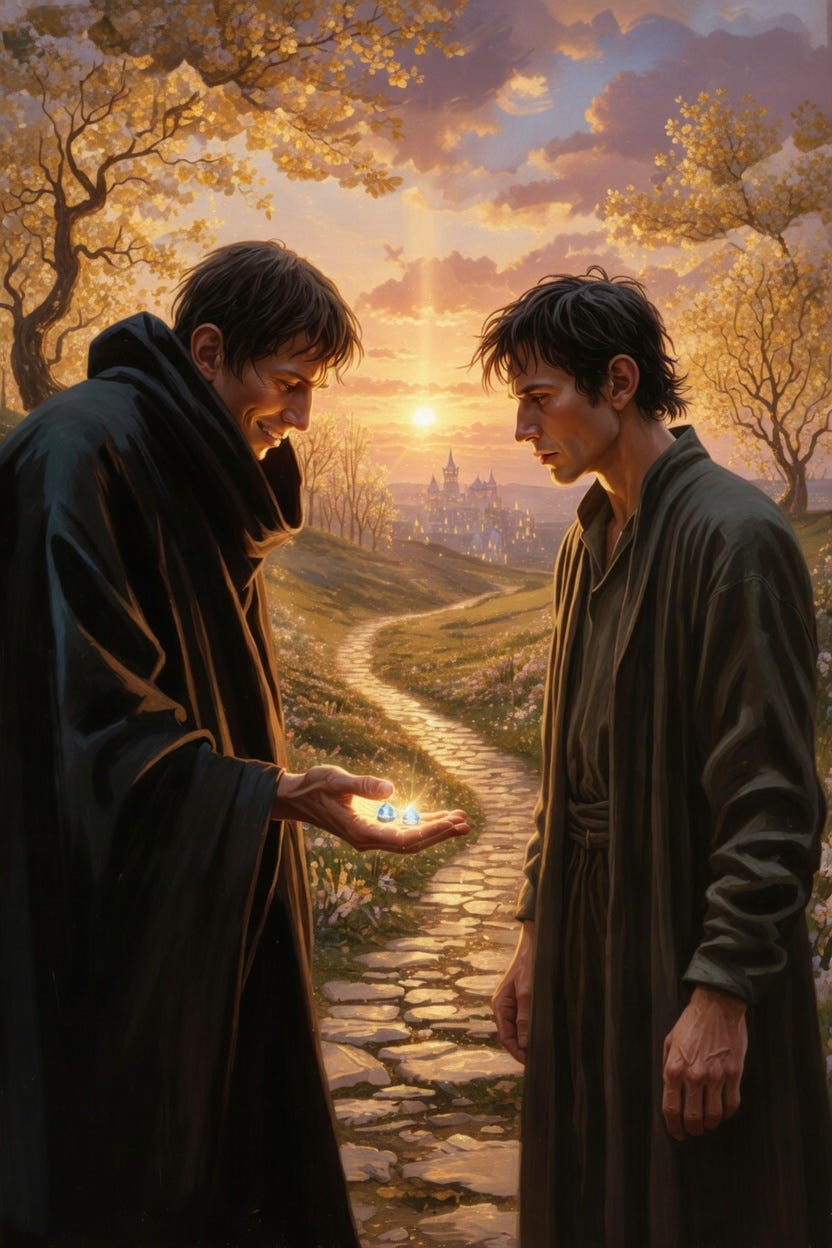 “Isaac, isn’t it?” the stranger said smoothly. “I’ve seen you reading those heavy old scrolls. Admirable. You should be proud of yourself… But tell me—does your heart ever grow tired of questions that have no answers?”